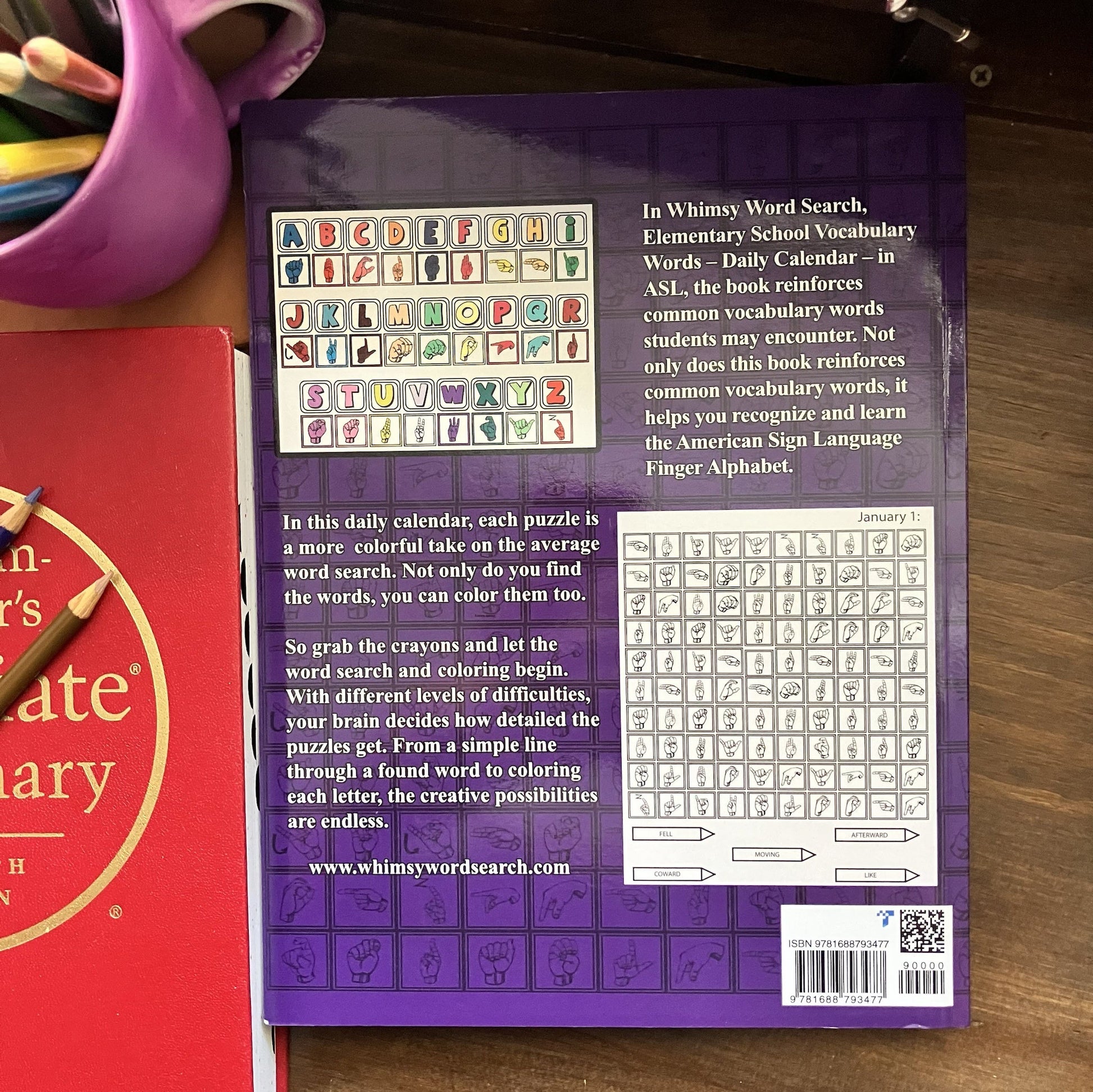 Description: In Whimsy Word Search, Elementary School Vocabulary Words – Daily Calendar – in ASL, the book reinforces common vocabulary words students may encounter. Not only does this book reinforces common vocabulary words, it helps you recognize and learn the American Sign Language Finger Alphabet.