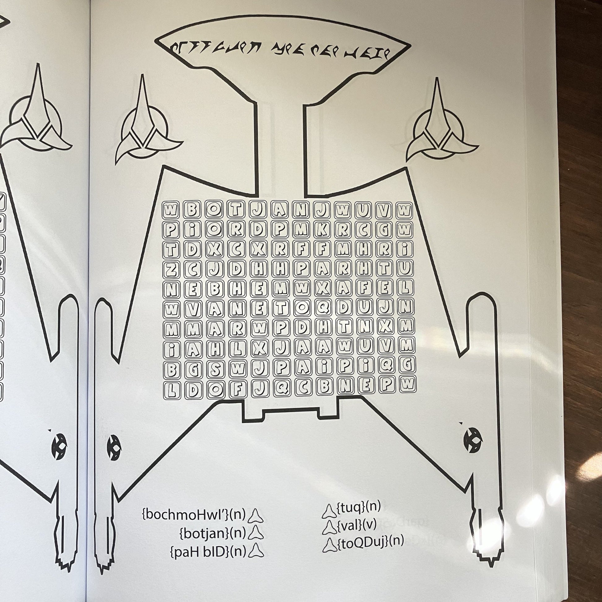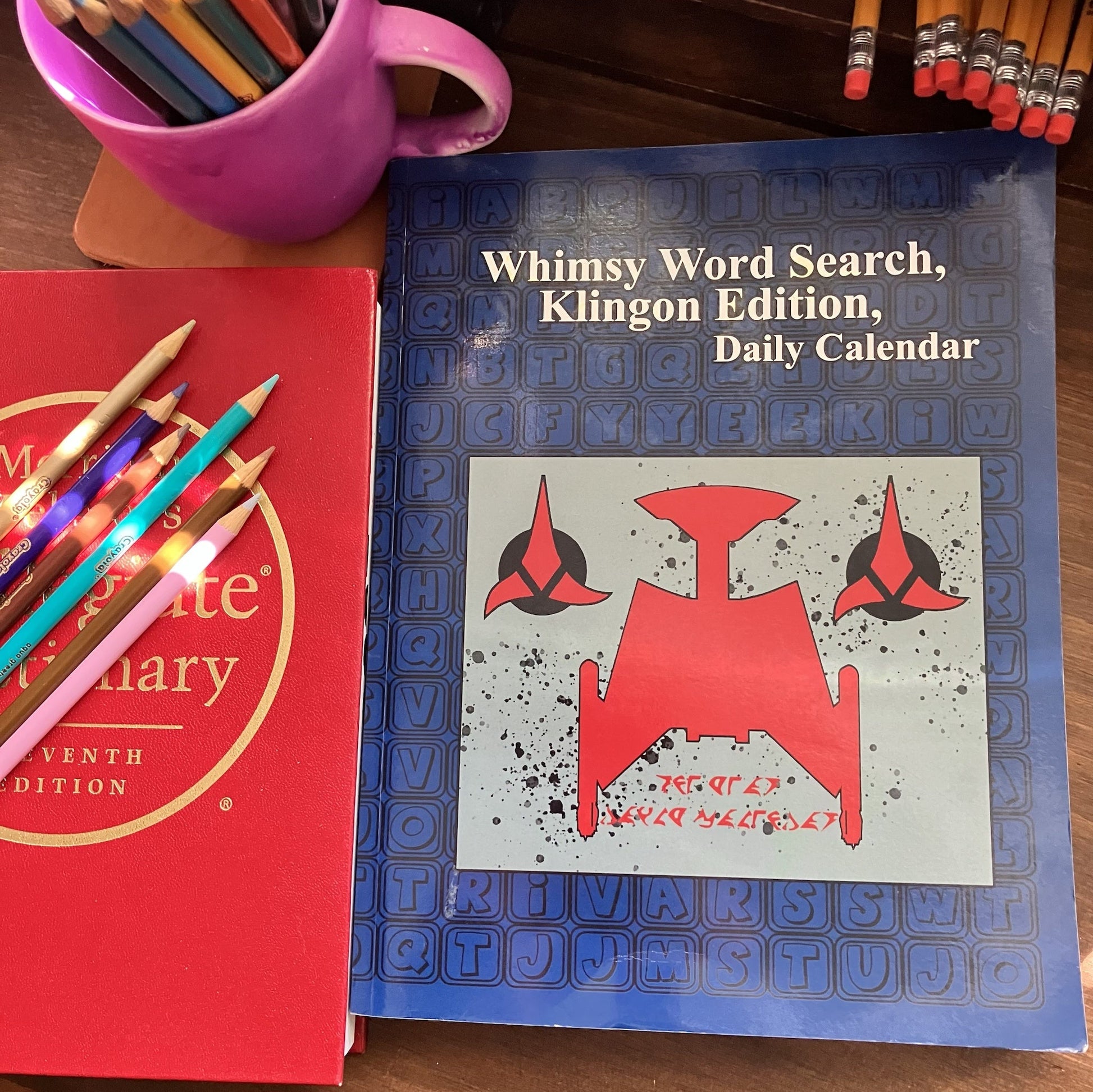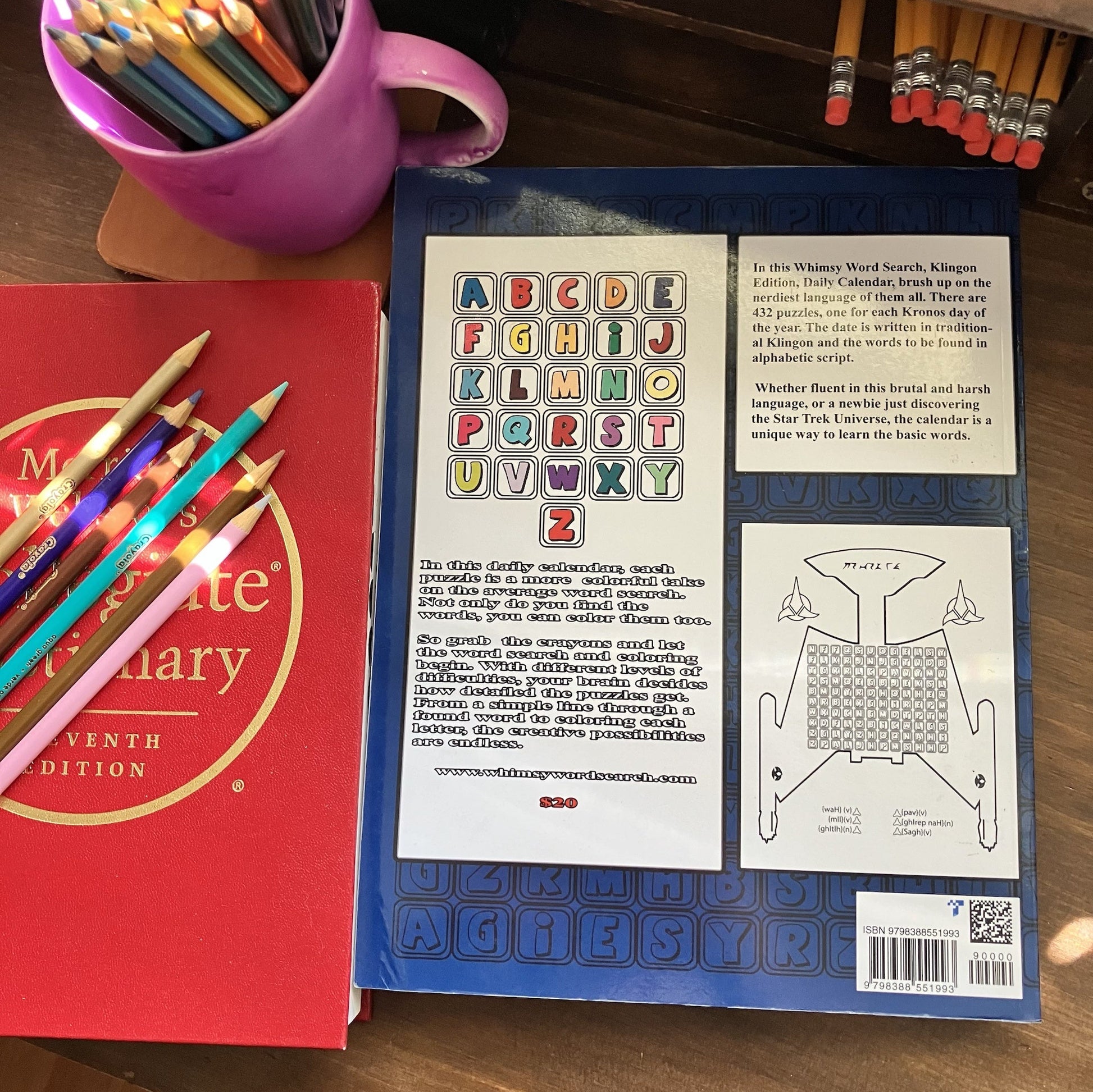 In this Whimsy Word Search, Klingon Edition, Daily Calendar, brush up on the nerdiest language of them all. There are 432 puzzles, one for each Kronos day of the year. The date is written in traditional Klingon and the words to be found in alphabetic script. Whether fluent in this brutal and harsh language, or a newbie just discovering the Star Trek Universe, the calendar is a unique way to learn the basic words.