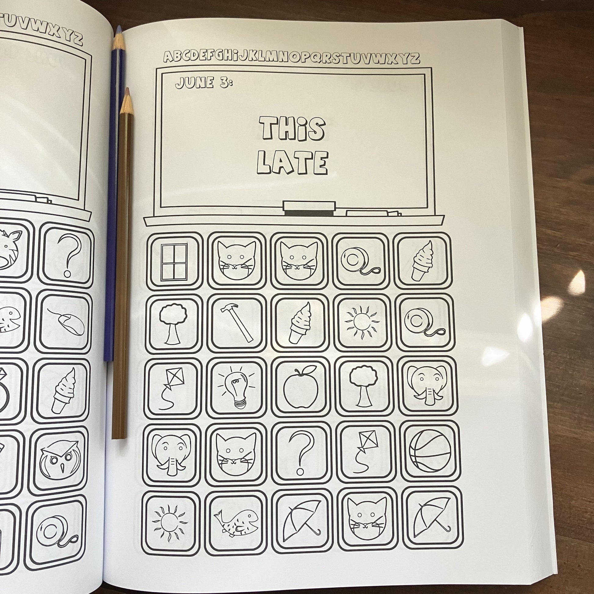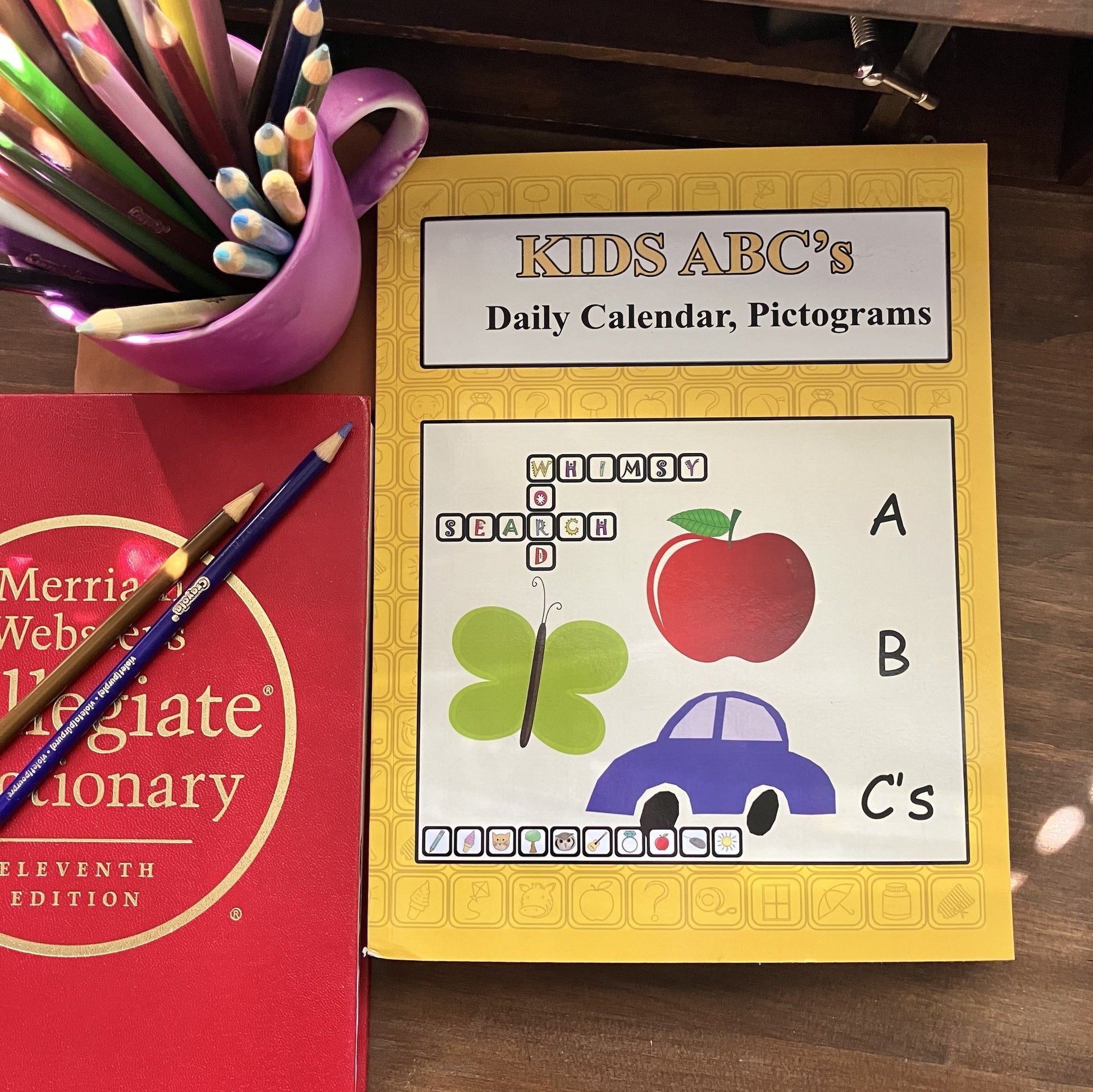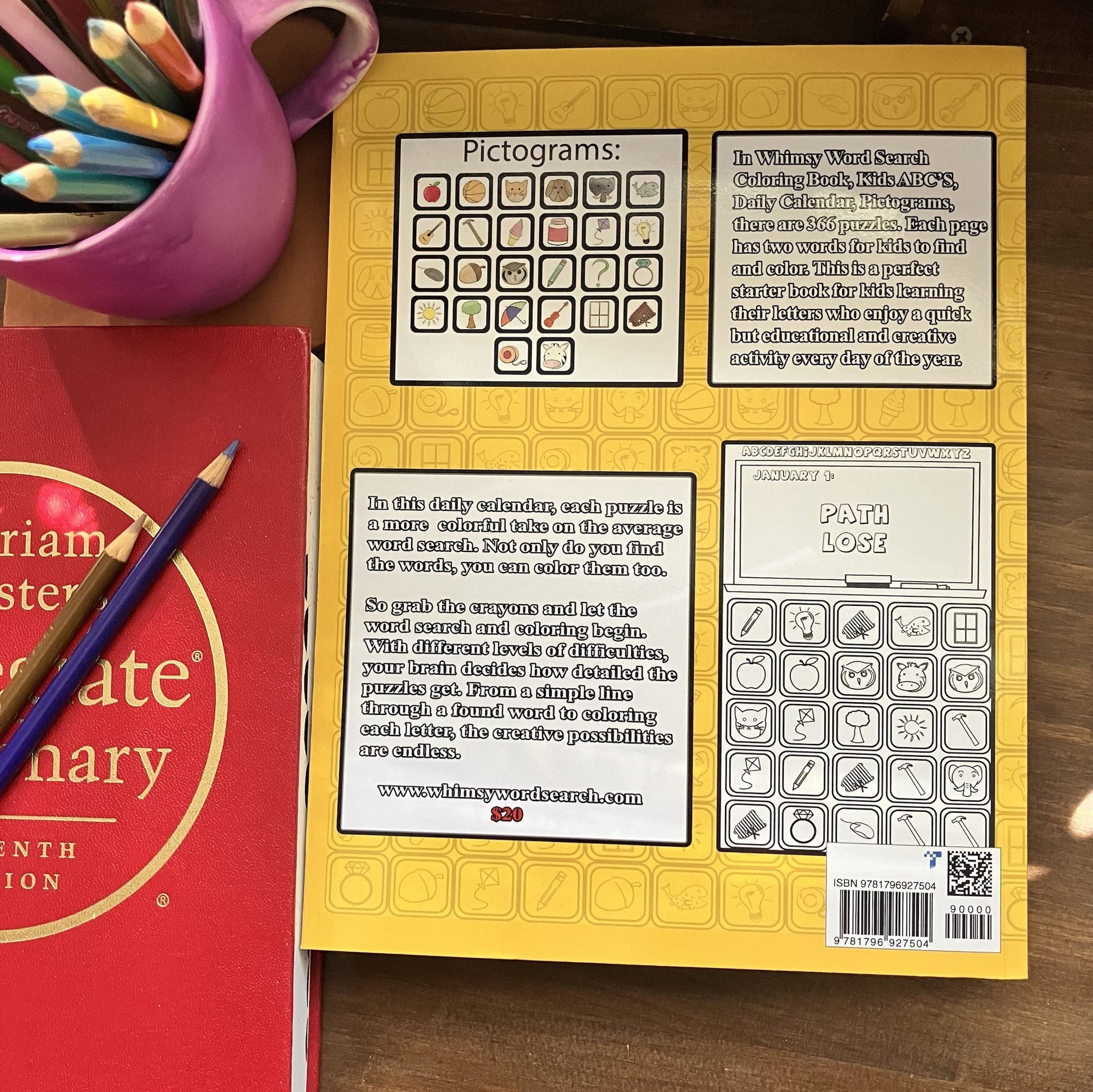 Description: In Whimsy Word Search Coloring Book, Kids ABC’S, Daily Calendar, Pictograms, there are 366 puzzles. Each page has two words for kids to find and color. This is a perfect starter book for kids learning their letters who enjoy a quick but educational and creative activity every day of the year.
