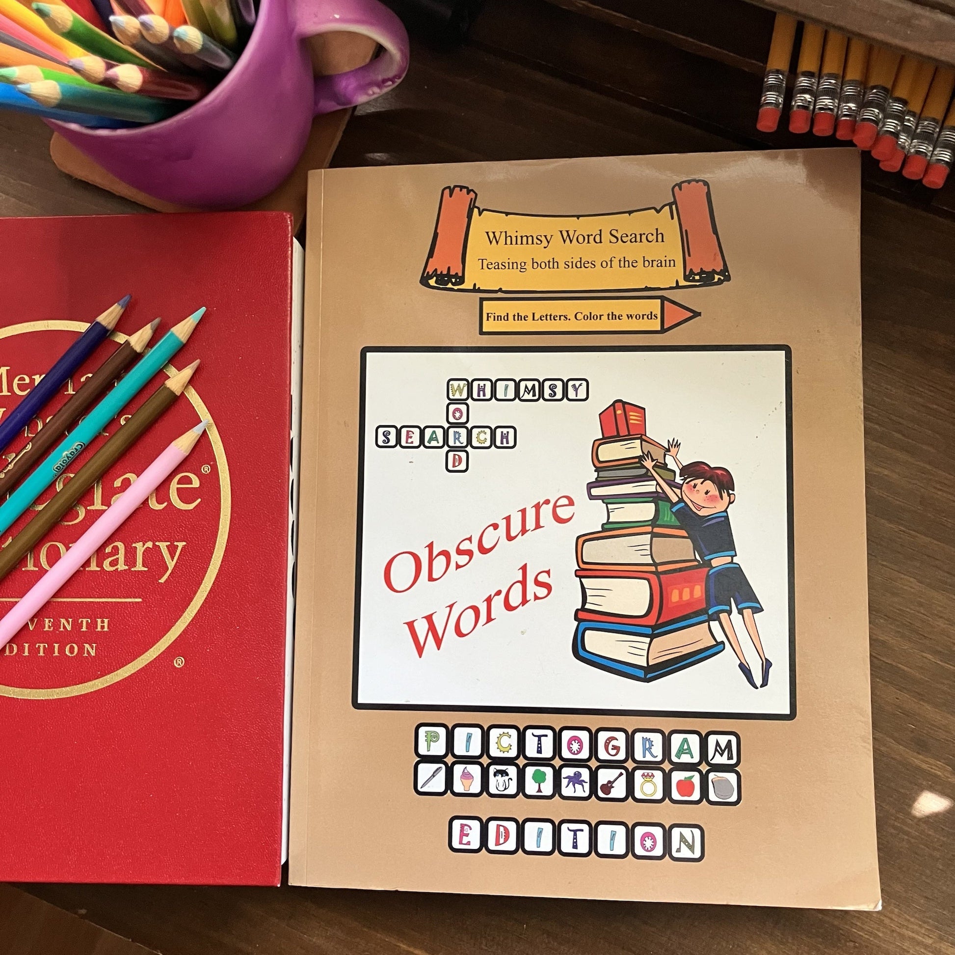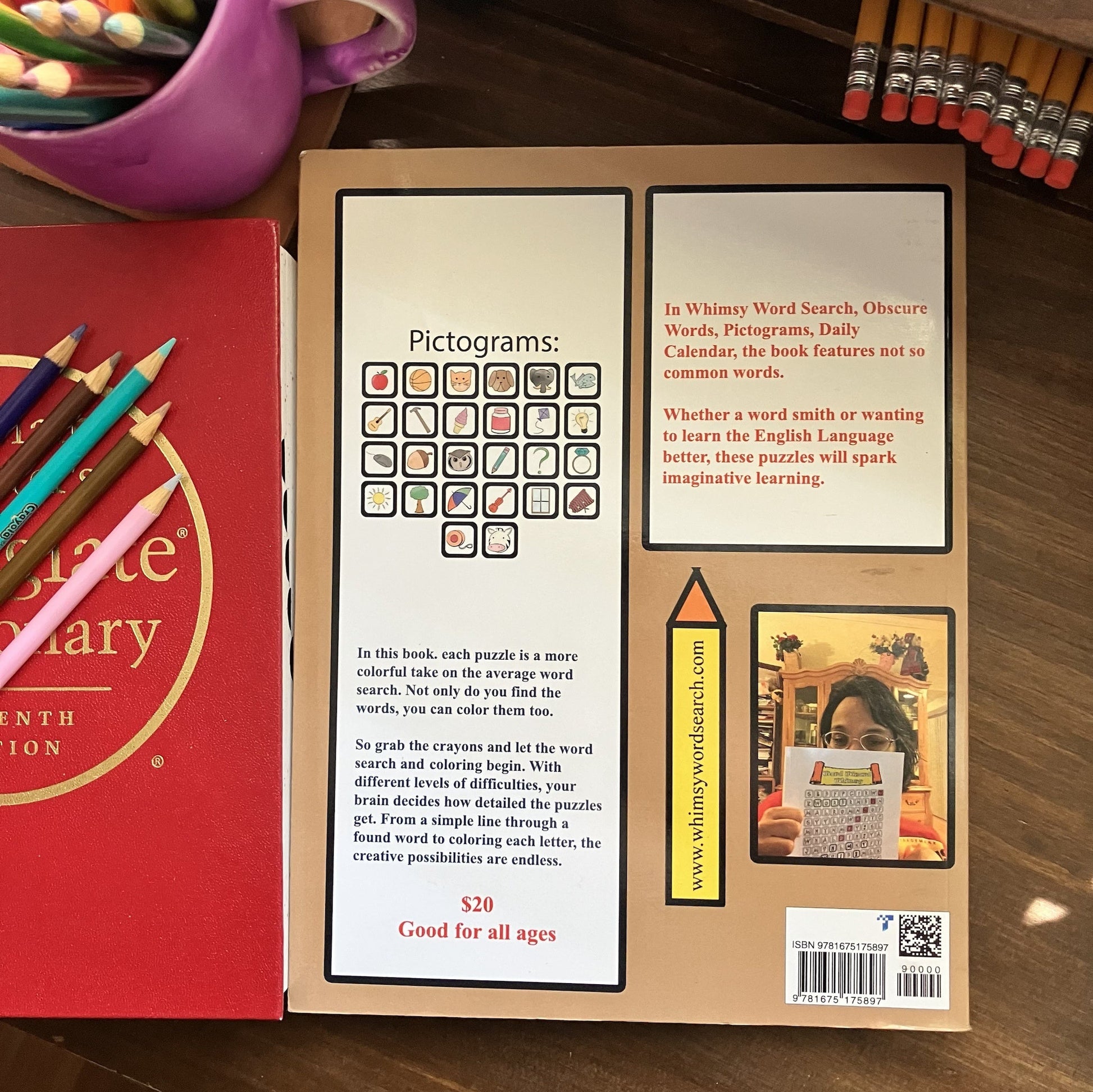 Description: In Whimsy Word Search, Obscure Words, Pictograms, Daily Calendar, the book features not so common words. Whether a word smith or wanting to learn the English Language better, these puzzles will spark imaginative learning.