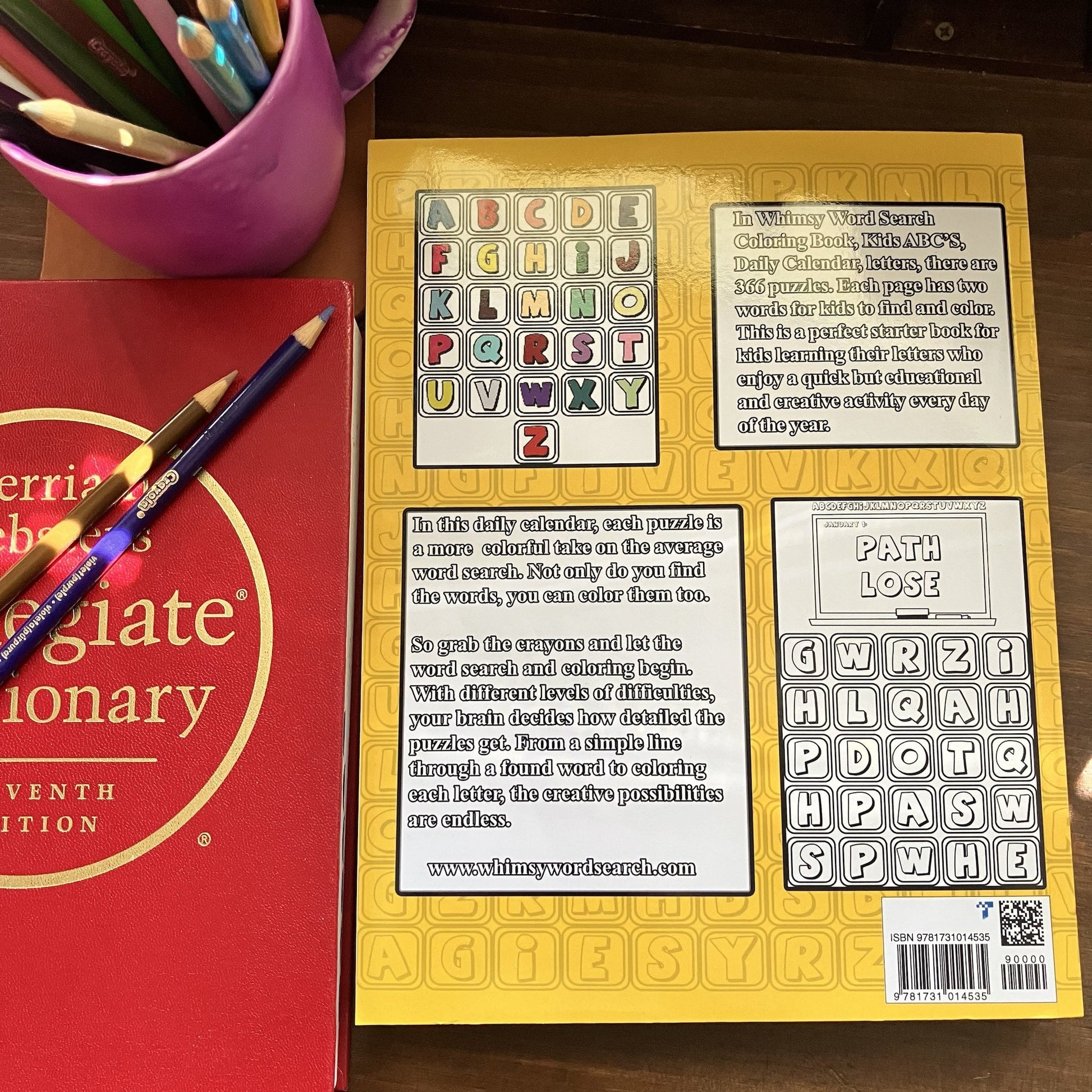 Description: In Whimsy Word Search Coloring Book, Kids ABC’S, Daily Calendar, letters, there are 366 puzzles. Each page has two words for kids to find and color. This is a perfect starter book for toddlers and young children learning their letters who enjoy a quick but educational and creative activity every day of the year.